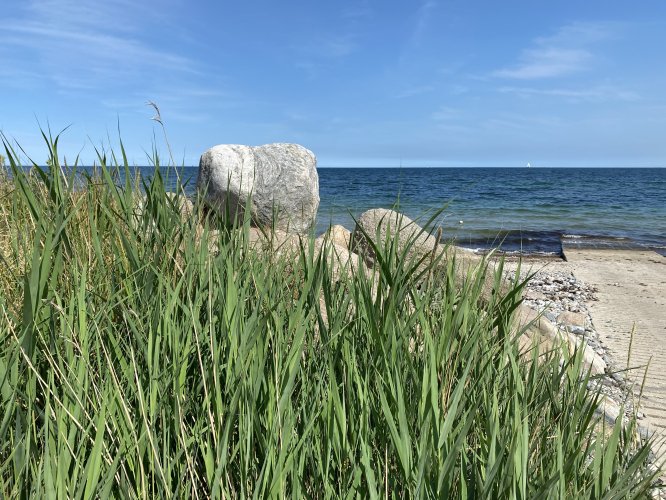 Malerisch eingebettet in Felder und Wiesen, Naturstrand und Steilküste